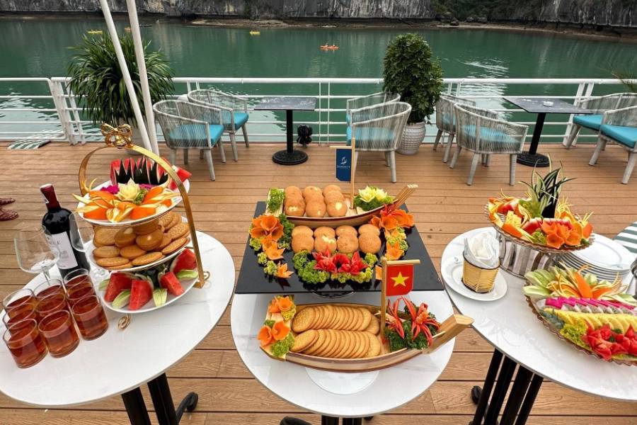 - Enjoy a Sunset Party on the sundeck with Vietnamese special tea, fresh tropical fruits and snacks.