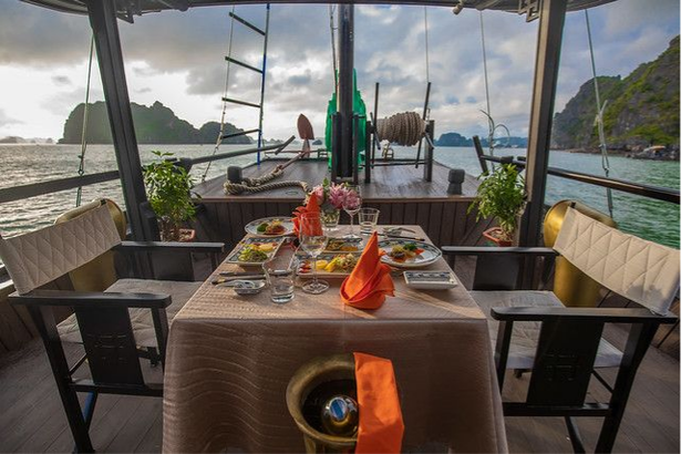 13:15 | Have lunch at the onboard restaurant, featuring seafood dishes from Quang Ninh. The wooden boat will start its journey to explore Bai Tu Long Bay, passing through limestone islands and beautiful scenery along the bay.