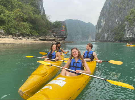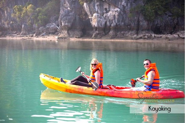The boat anchors at the Cong Do area, a perfect spot for guests to go kayaking among majestic limestone mountains.